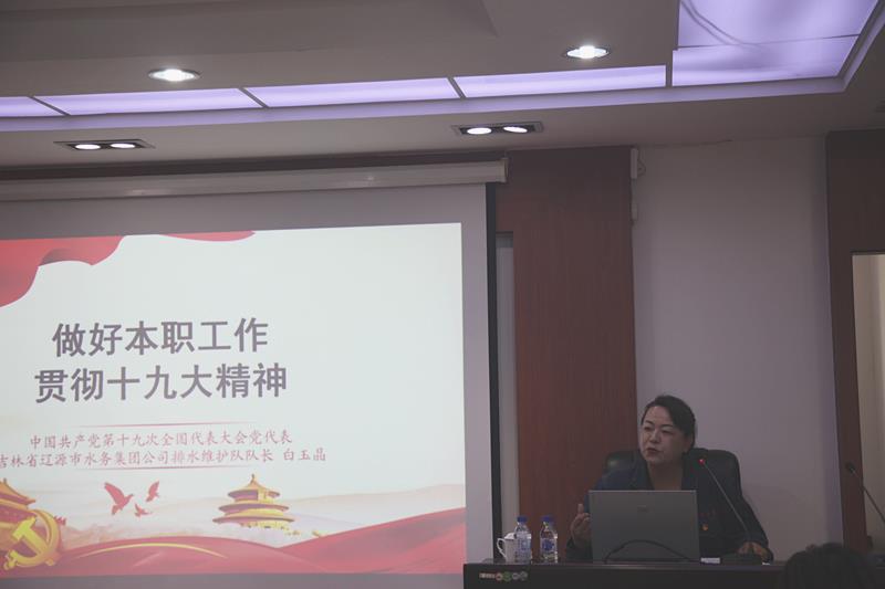 9月13日下午,辽源市住房公积金管理中心邀请辽源市水务集团公司排水维护队队长白玉晶同志来中心进行讲座。白玉晶同志曾荣获“辽源五一劳动章”、“辽源好人”、“吉林省五一劳动奖章”等荣誉称号。2017年5月29日,在吉林省第十一次党代表大会选举为吉林省出席党的十九大代表。2018年3月,获全国三八红旗手荣誉称号。